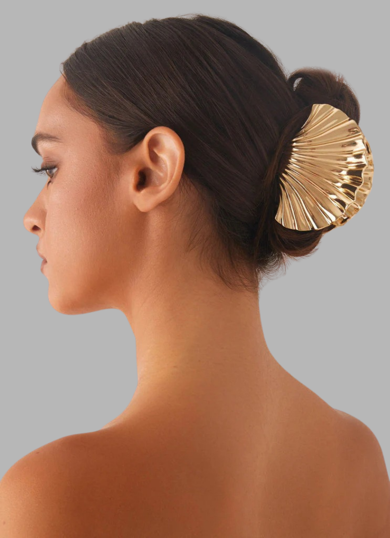 We introduce our Shell Clip, the perfect statement finish for any look. With a sculptural shell-shaped design dipped in gold hardware, this sleek and bold clip catches the light with every movement — made for warm nights where every detail matters.